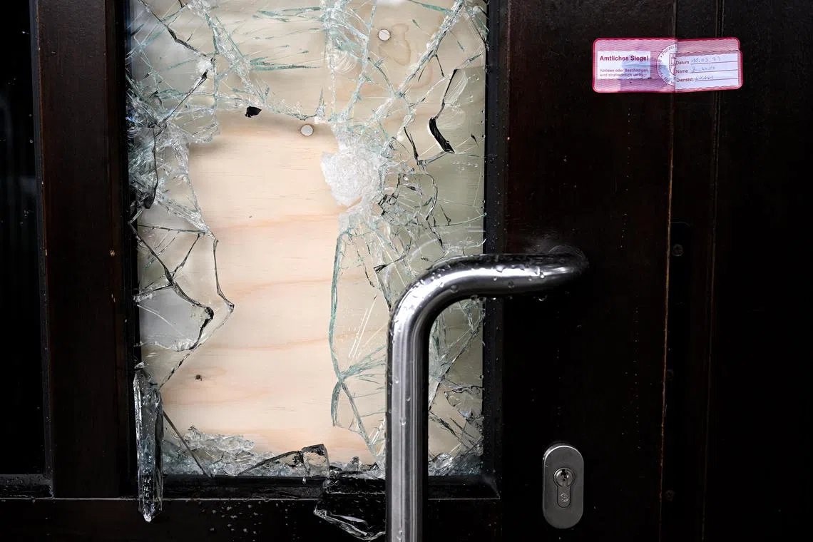 A police seal on the damaged door to the building that houses the Kingdom Hall of Jehovah’s Witnesses, the scene of the shooting, in Hamburg.