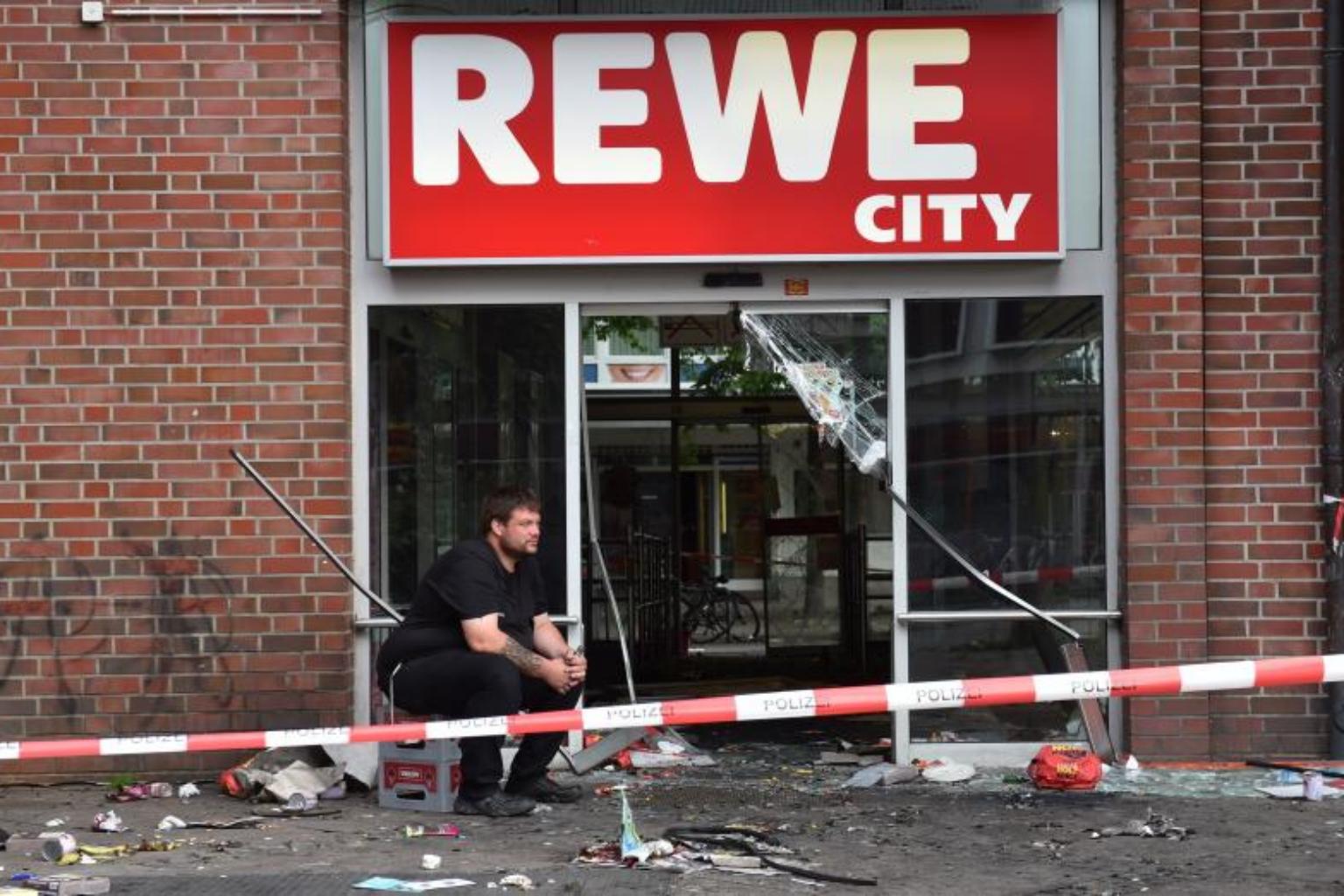A man sits in front of a destroyed Rewe City supermarket after riots in Hamburg's Schanzenviertel district on July 8, 2017 in Hamburg, northern Germany, where leaders of the world's top economies gather for a G20 summit.