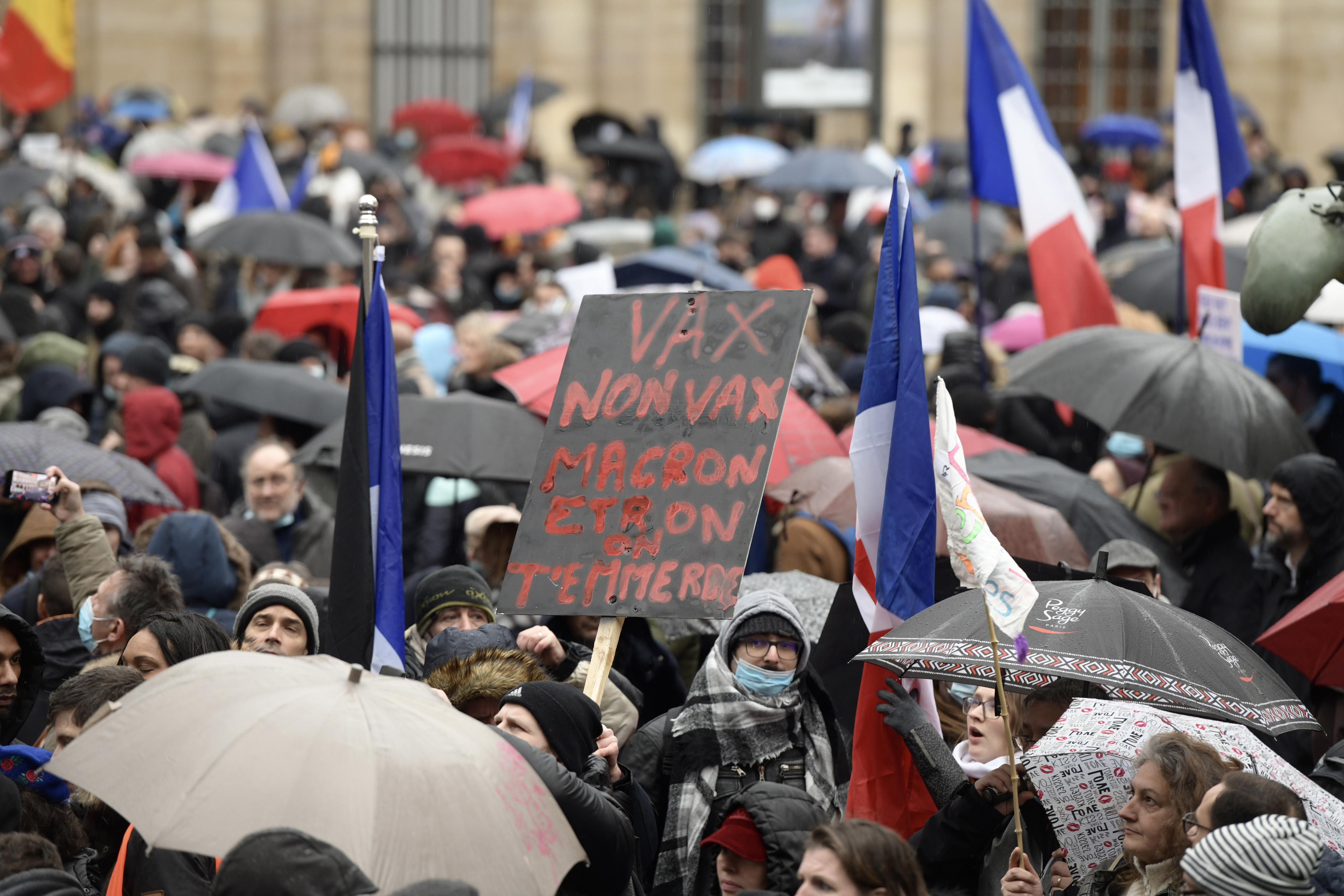 Demonstrators protest against vaccination pass rules in Paris, France, on Jan. 8, 2022.