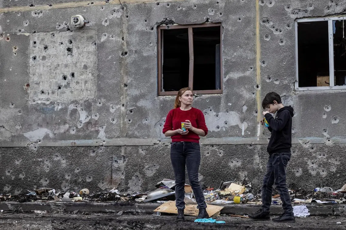 Standing among the fire-destroyed market stalls and skeletons of burnt-out cars, 53-year-old teacher Olena looked up blankly at the balconies hanging precariously from the facades of the damaged tenement blocks.