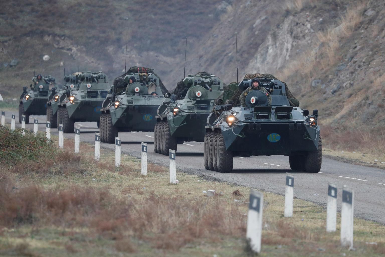 Armoured personnel carriers of the Russian peacekeeping forces drive along a road near Lachin in the region of Nagorno-Karabakh, on Nov 13, 2020.