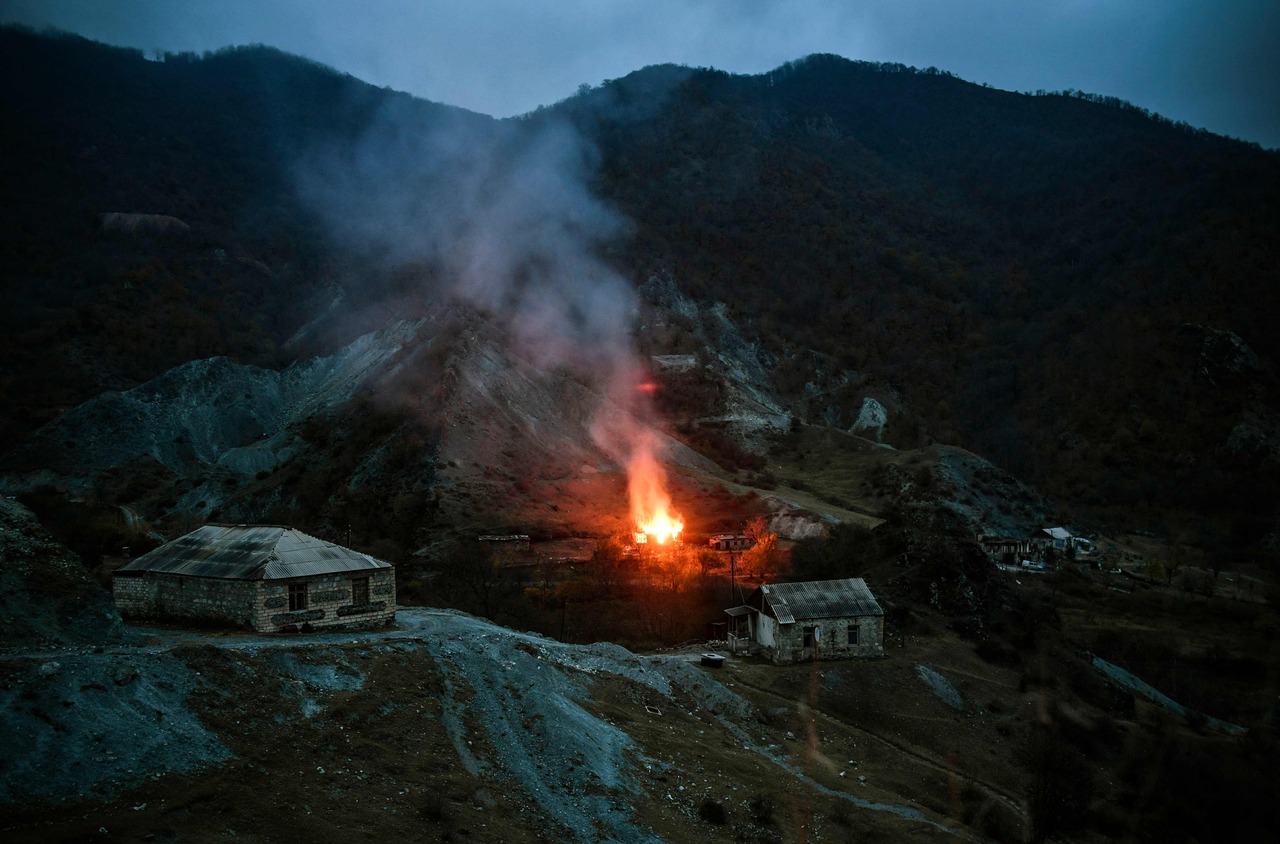Thick plumes of smoke rose over the valley near the village of Charektar after residents set their homes on fire, preferring to leave devastation in their wake and homes that would be uninhabitable by Azerbaijanis.