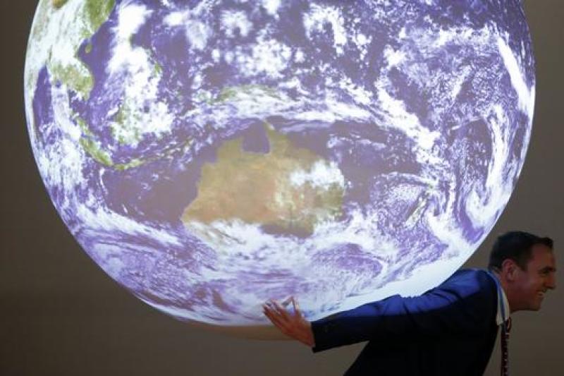 A participant poses with a replica of the planet during the World Climate Change Conference 2015 (COP21) at Le Bourget, near Paris, France, on Dec 8, 2015.
