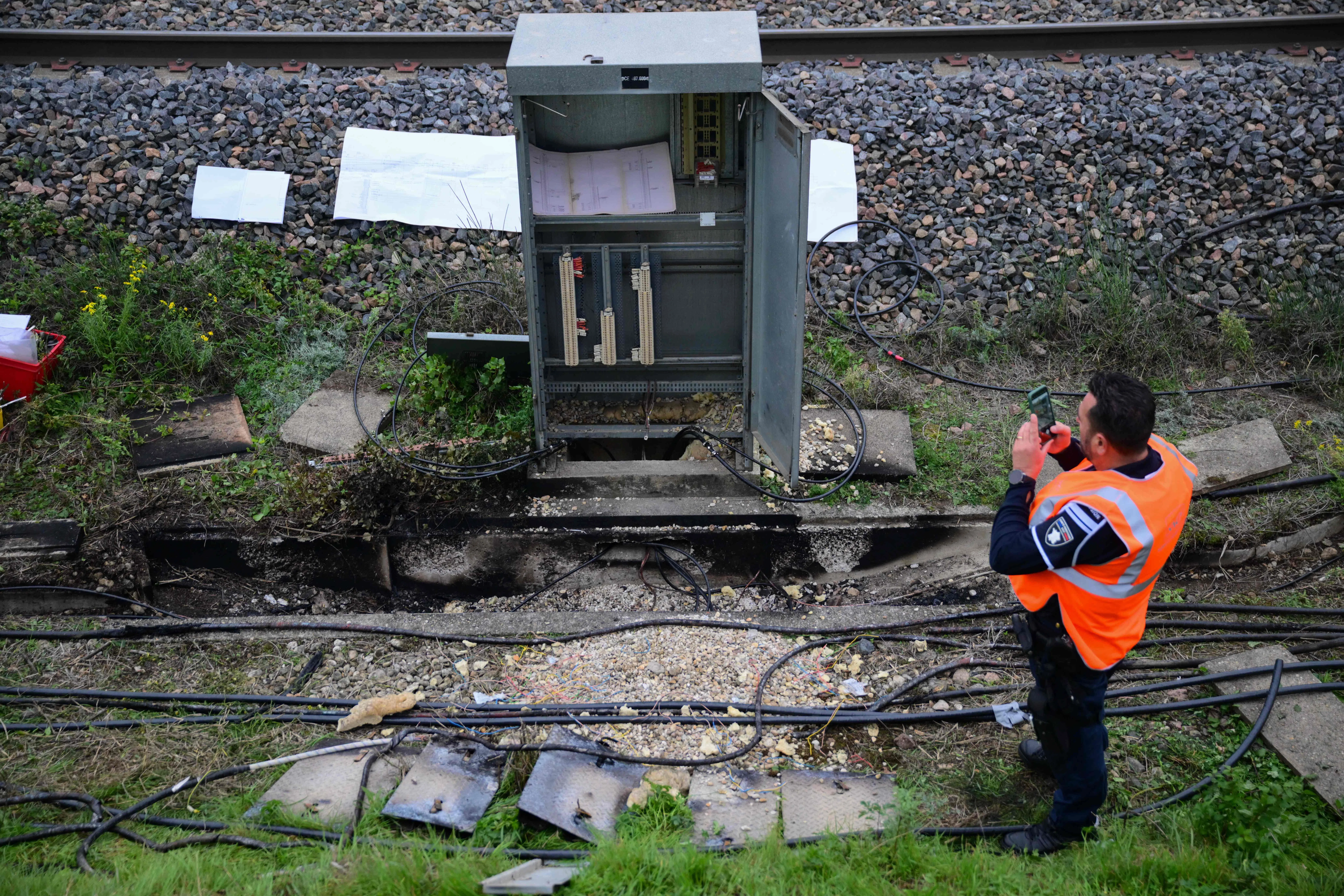 Workmen dealing with charred cables and equipment along a section of railway line affected by arson, south of Valence's TGV railway station, in the south-east of the country, on Oct 27.