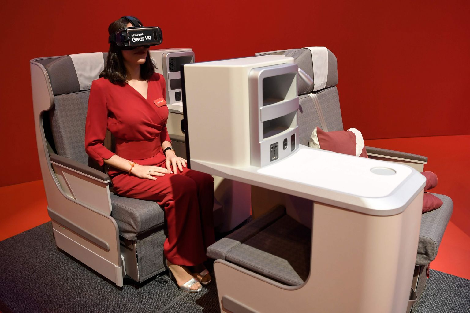 A hostess uses virtual reality glasses at the Iberia stand during the International Tourism Fair in Madrid, on Jan 17, 2018.