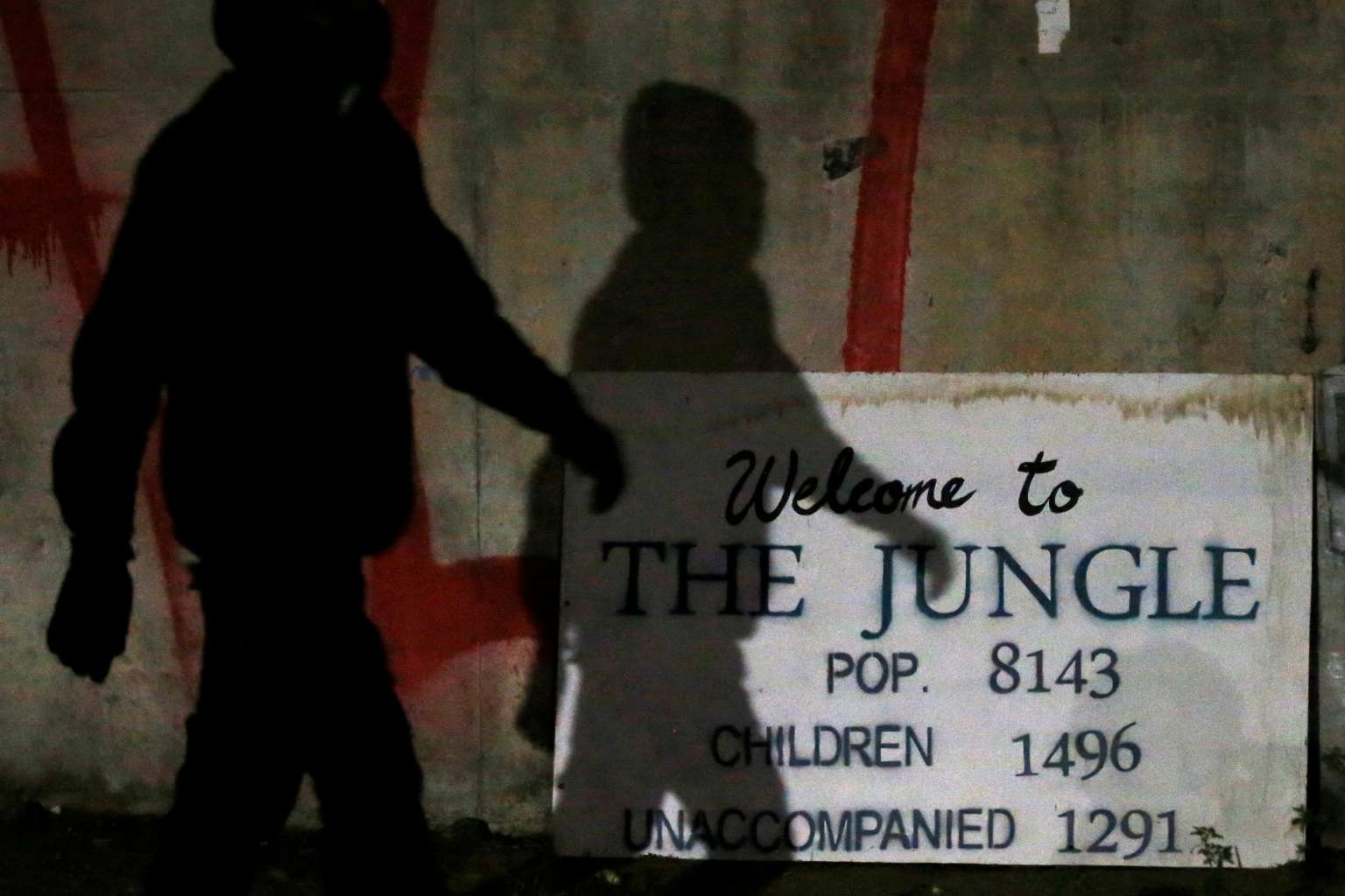 The shadow of a migrant falls on a sign with the population of The Jungle at the end of the first day of the evacuation.