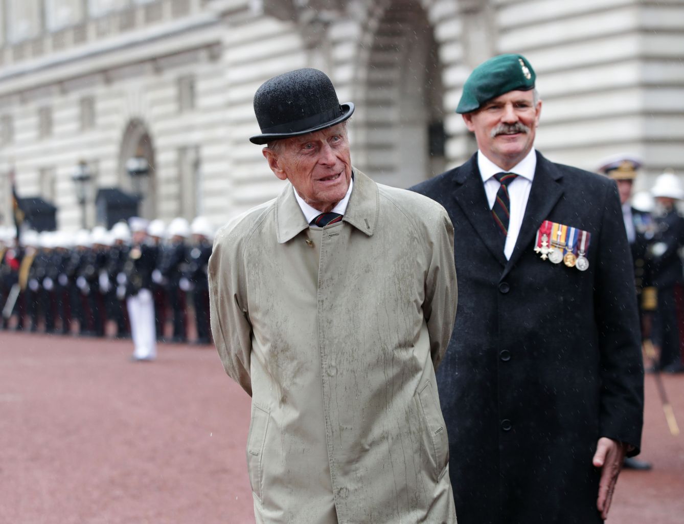 In his last public engagement on Wednesday, Philip, sporting a bowler hat and mac, met serving troops, veterans and cadets in the pouring rain, before watching as a unit of marines marched past him in formation in a ceremonial procedure known as taking the salute.