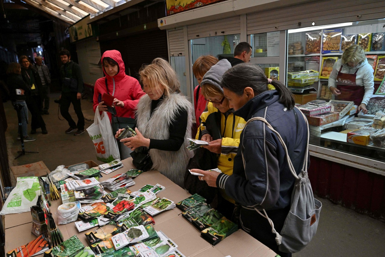 Despite everything, 63-year-old Nadia Grebenyk is doing brisk business at her stall selling seeds for growing cucumbers, watermelon and flowers.