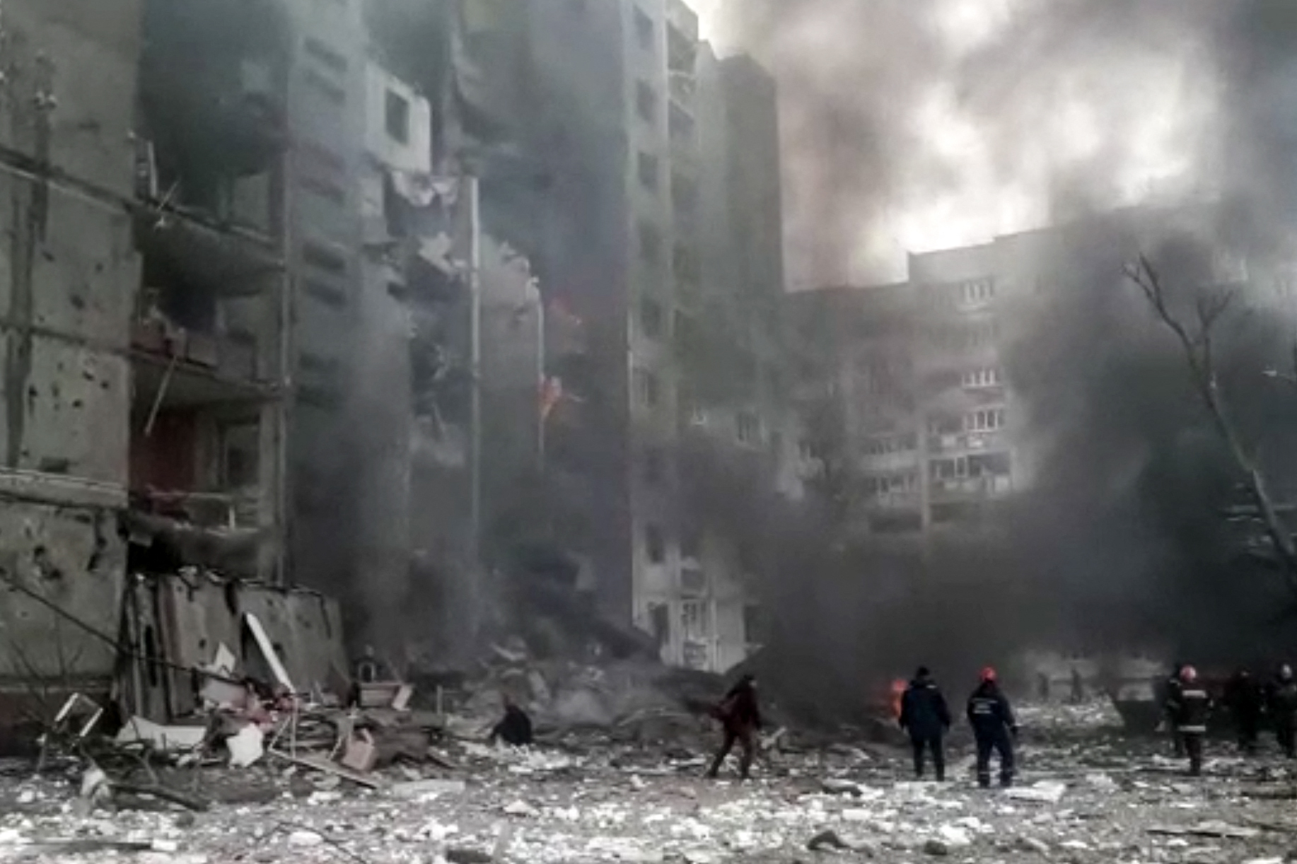 Ukraine’s emergencies service released images showing plumes of smoke coming out of heavily damaged apartments, with debris scattered across a yard and rescuers carrying bodies on stretchers.