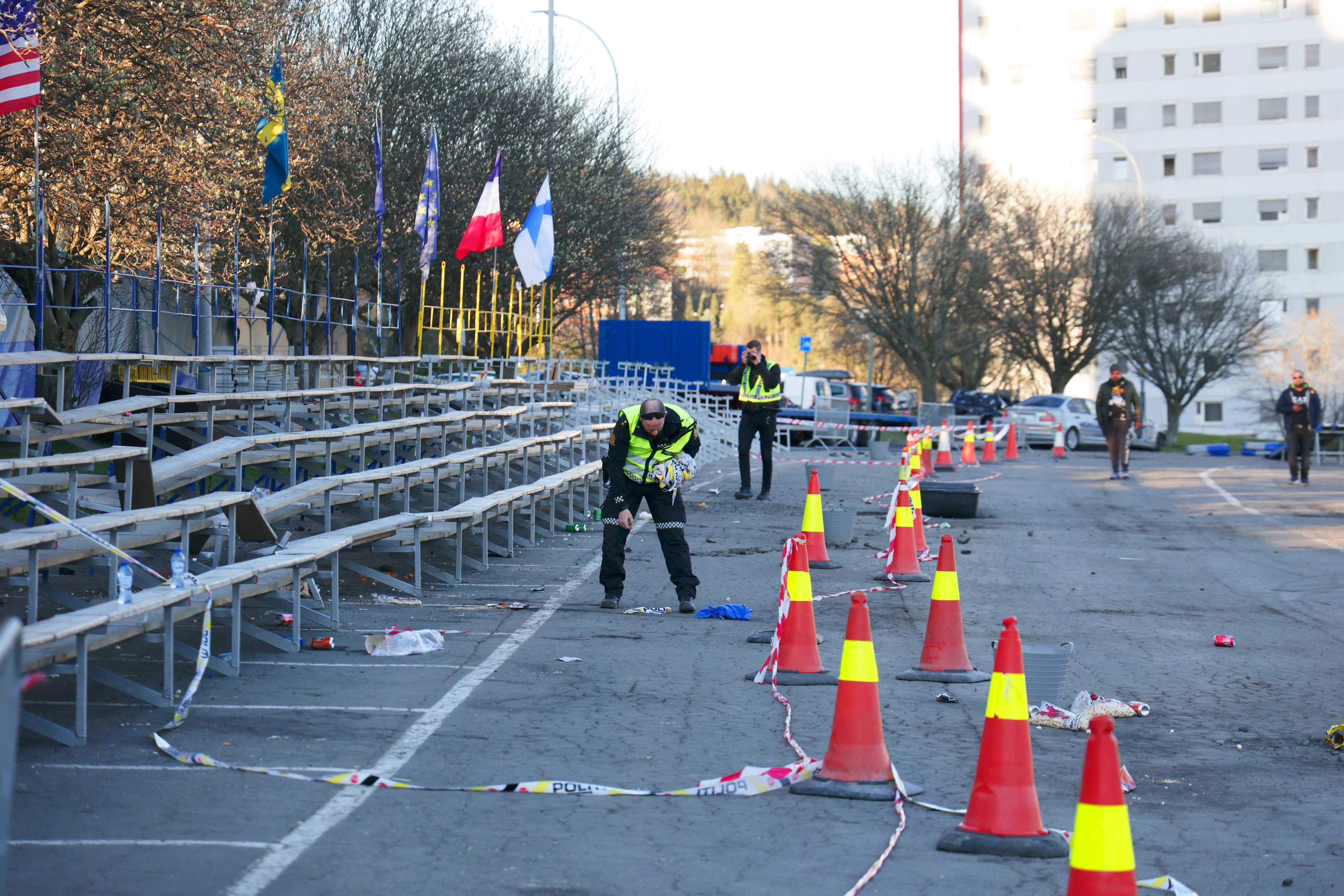 Members of the emergency services work at the scene where a car drove into a grandstand during a motor show in Oslo on April 24, 2022.