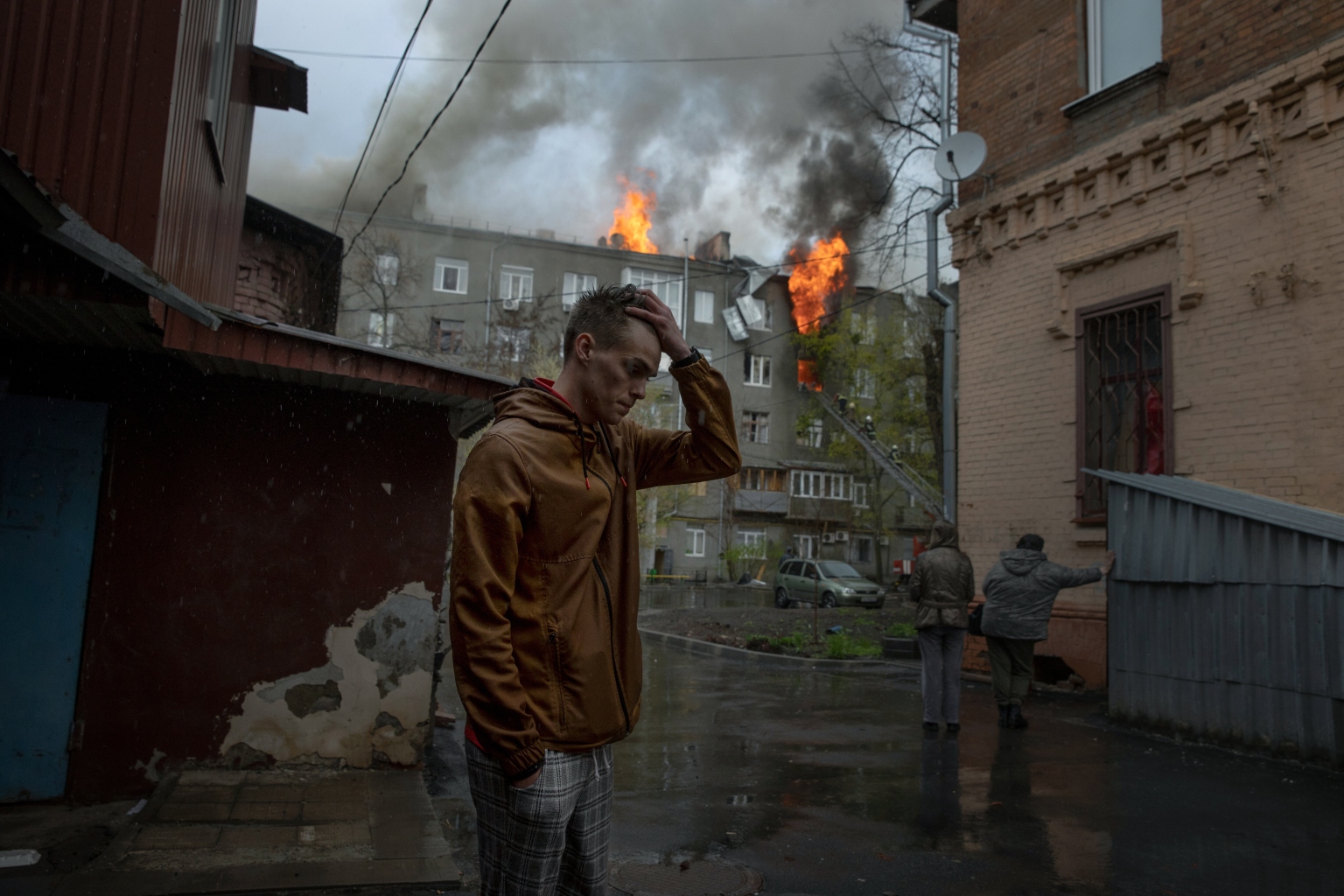 An apartment building burns after a rocket barrage that struck central Kharkiv, Ukraine, on April 17, 2022.