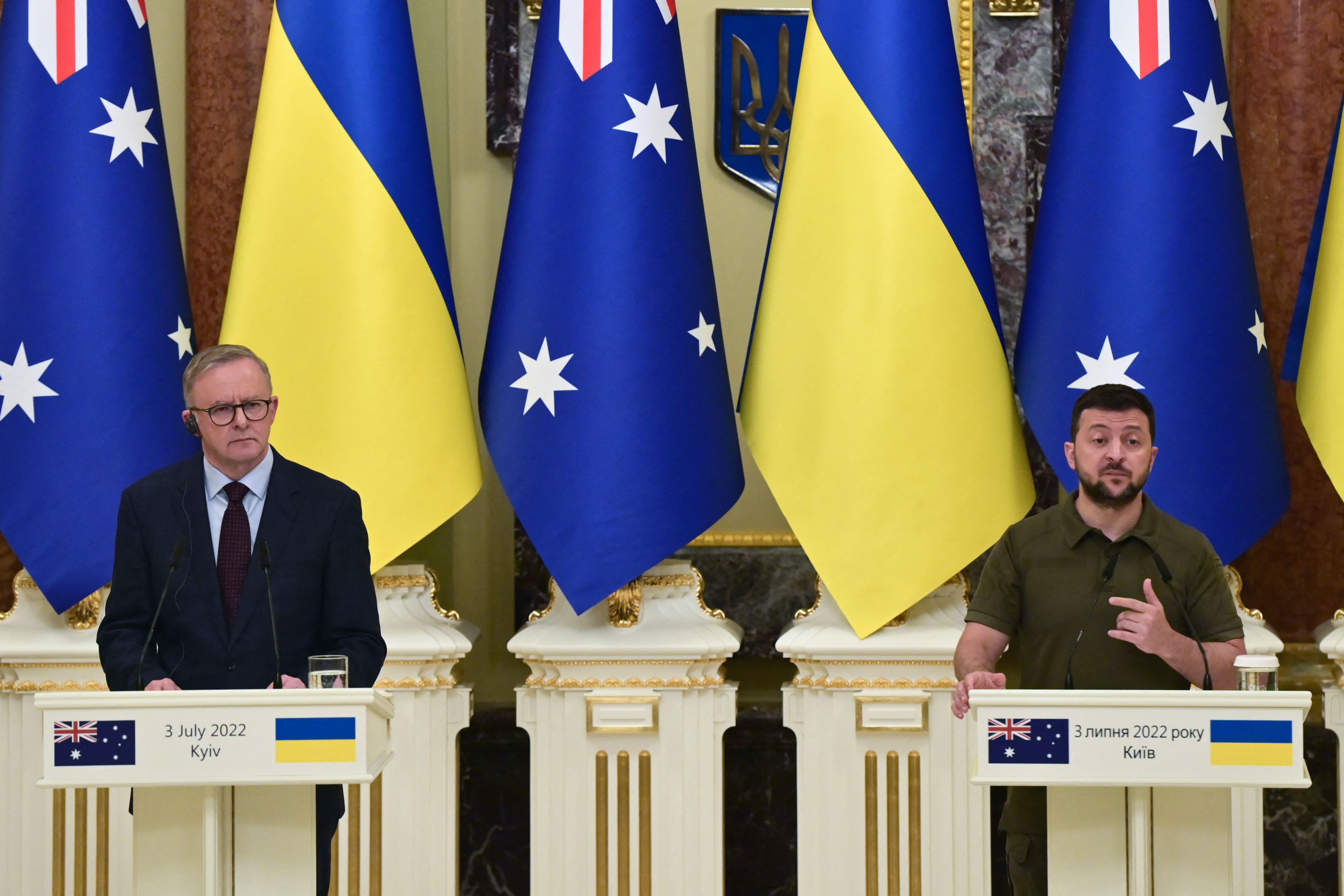Australia's Prime Minister Anthony Albanese (left) and Ukrainian President Volodymyr Zelensky hold a press conference in Kyiv, on July 3, 2022.