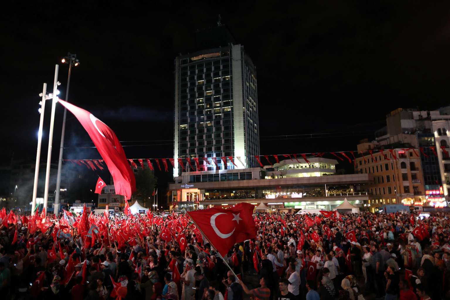 Supporters of Turkish President Recep Tayyip Erdogan shout slogans and hold flags during a demonstration against the July 15 failed coup attempt, at Taksim Square, in Istanbul, Turkey, seen on July 20.