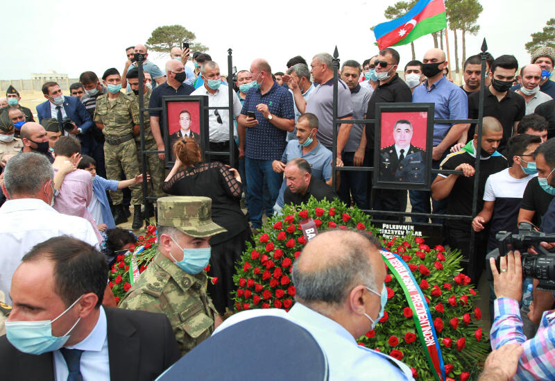 Mourners attend the funeral of Azerbaijani servicemen killed in border clashes with Armenia earlier this week, in Baku, on July 15, 2020.
