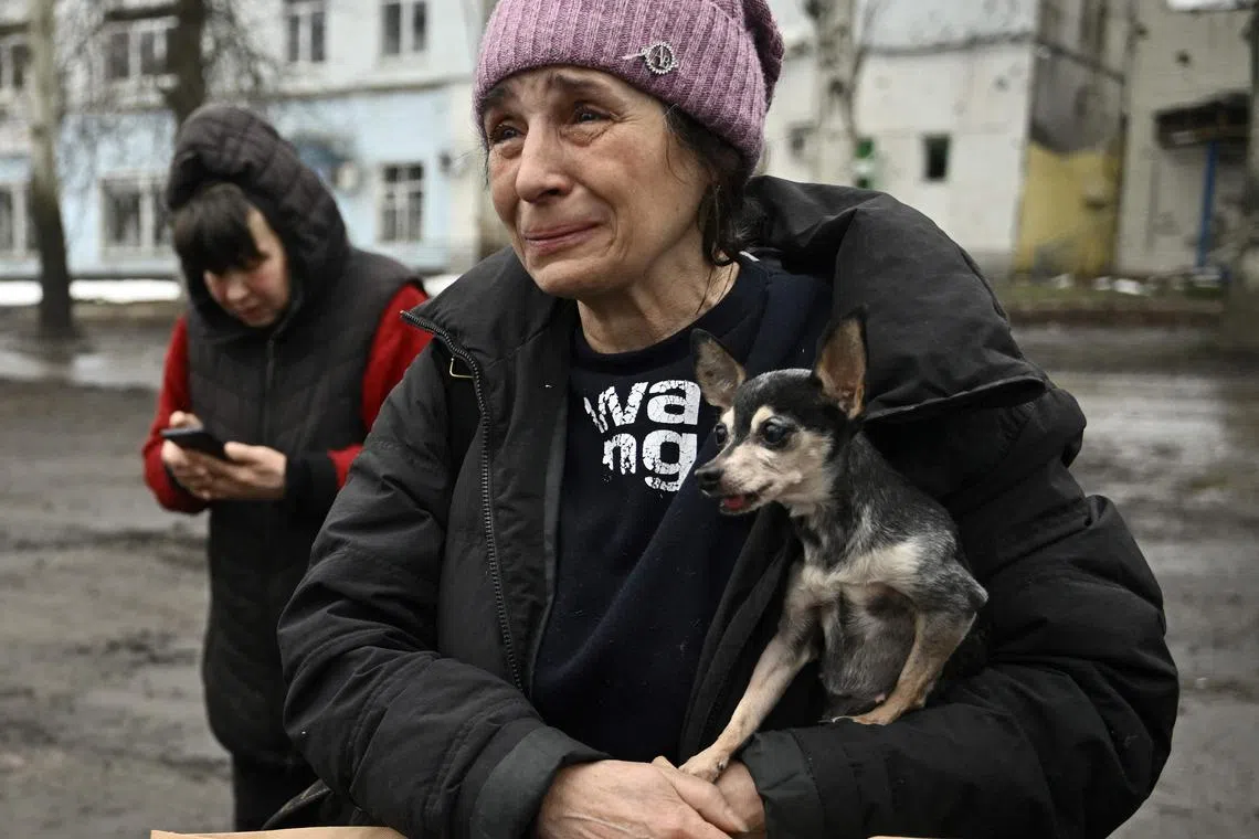 A civilian evacuated from Bakhmut crying while carrying her shivering chihuahua, after stepping out of a Ukrainian army armoured personnel carrier in Chasiv Yar.