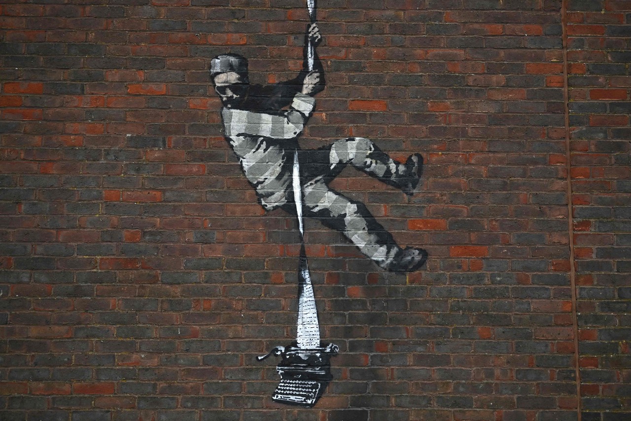 An artwork of a prisoner escaping by street artist Banksy on the side of Reading Prison, west of London.