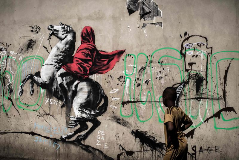 One mural, on a street in northern Paris where migrants sleep rough, shows a black girl spraying a pink wallpaper pattern over a swastika. The painting was subsequently defaced to make it look like she was painting the Nazi symbol herself.