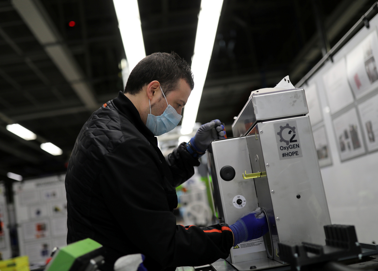 An employee works on the production line of a new medical respirator called OxyGEN in Spain.