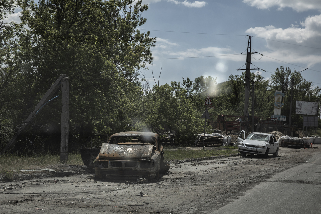 Destroyed vehicles on a road in Sievierodonetsk, Ukraine, on May 24, 2022.