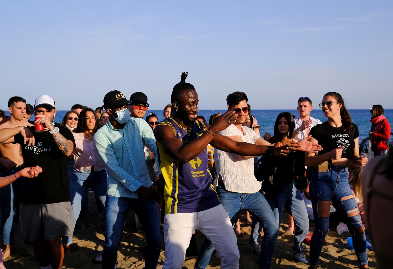 People dance at Barceloneta beach in Barcelona, Spain, April 2, 2021.