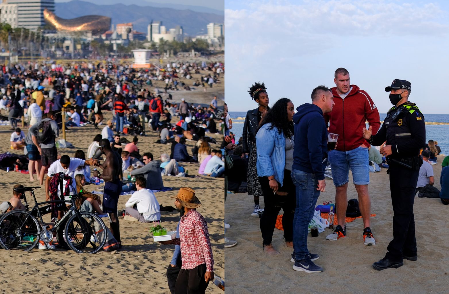 People spend time (rleft) at Barceloneta beach in Barcelona, Spain, while a police office speaks with tourists there (right).