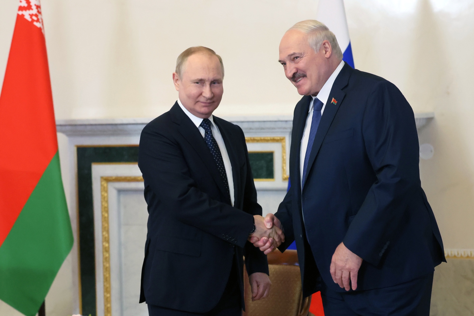 Belarusian President Alexander Lukashenko (right) with Mr Vladimir Putin during their meeting in St. Petersburg, Russia, on June 25, 2022.