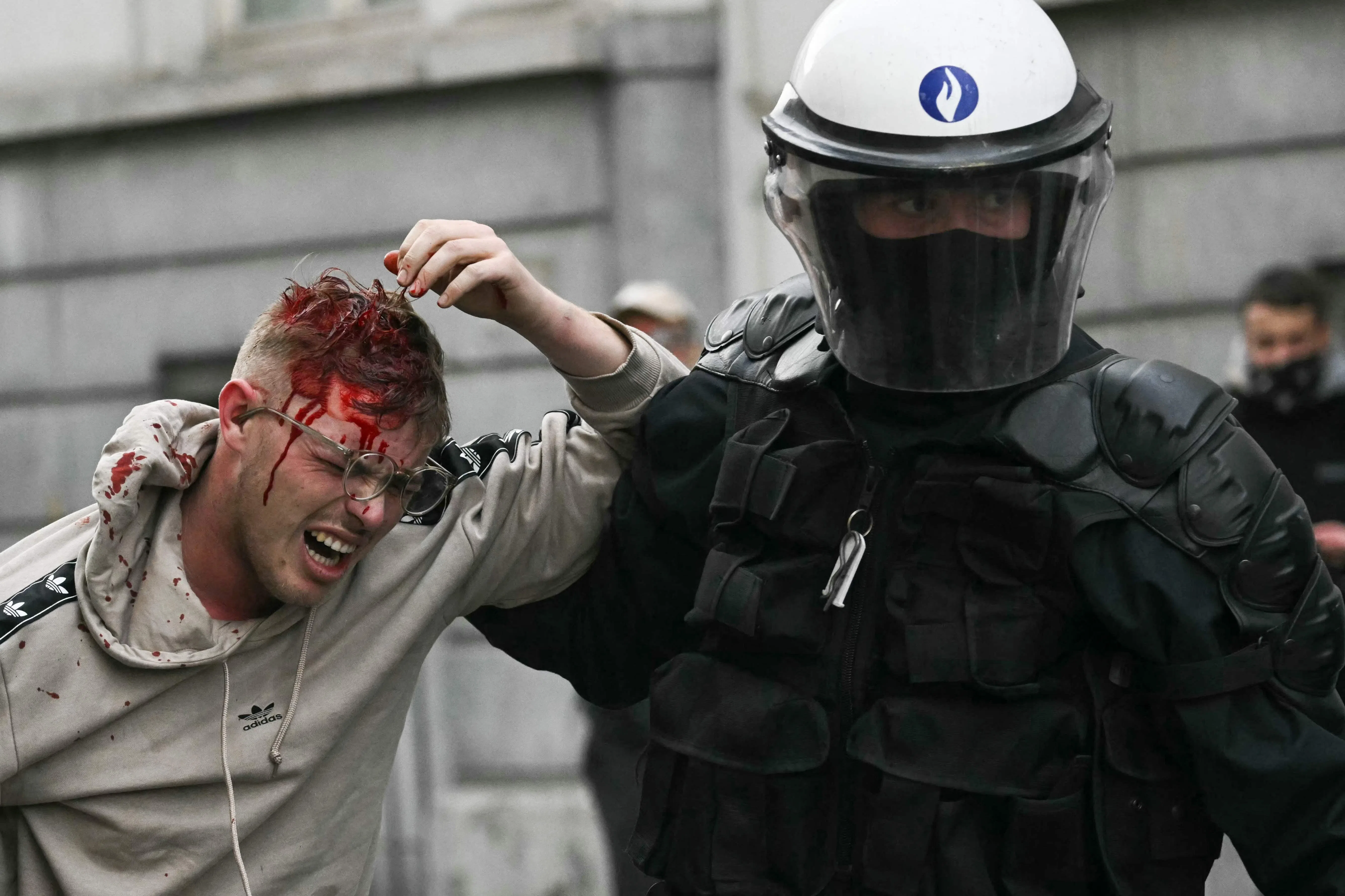 A police officer walking with a wounded man, during protests by farmers in Brussels on Dec 18 against the EU-Mercosur free-trade deal between the EU and the South American countries of Argentina, Brazil, Paraguay and Uruguay.