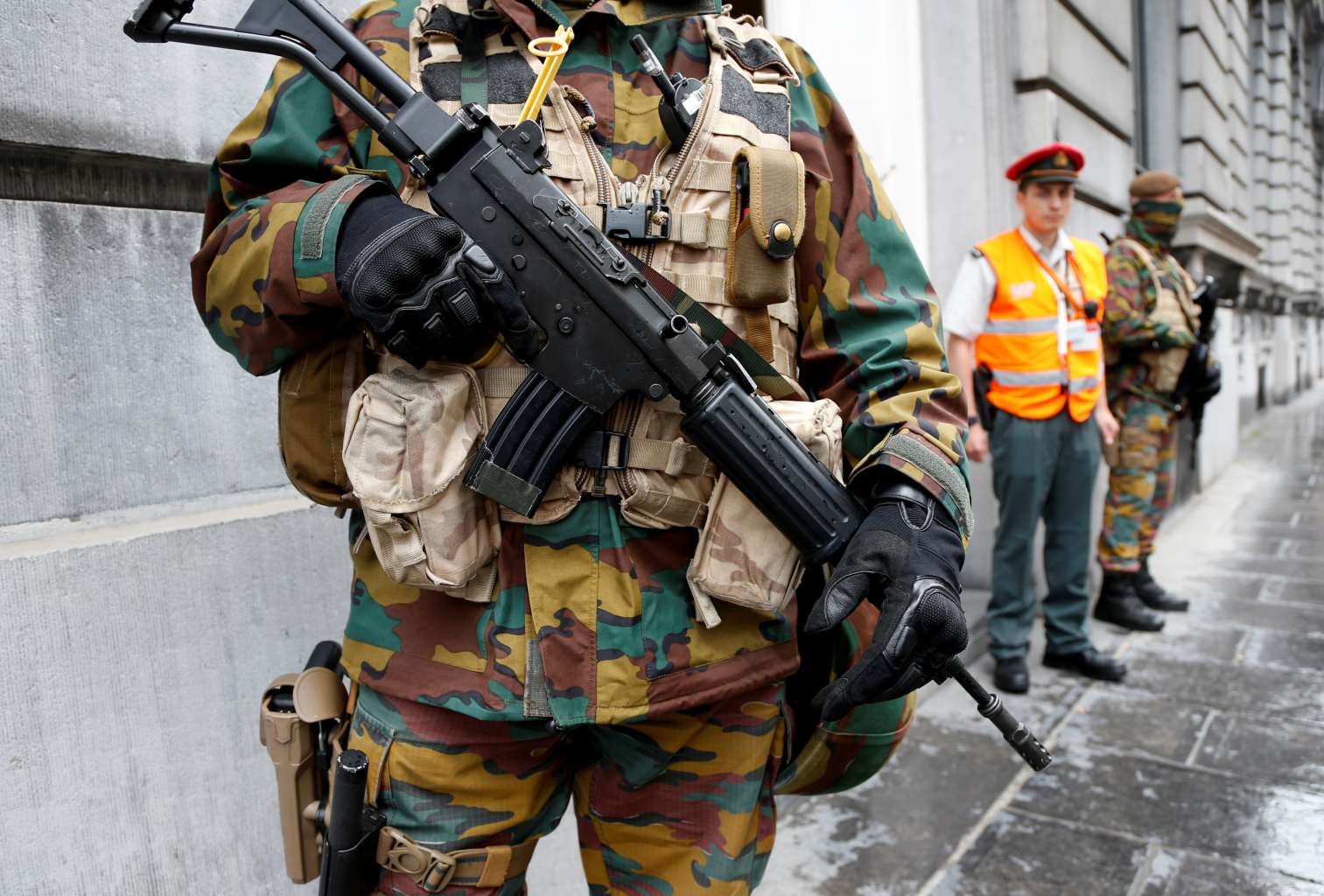 A Belgian soldier stands guard during a meeting of the government's security council in Brussels on June 18, 2016.