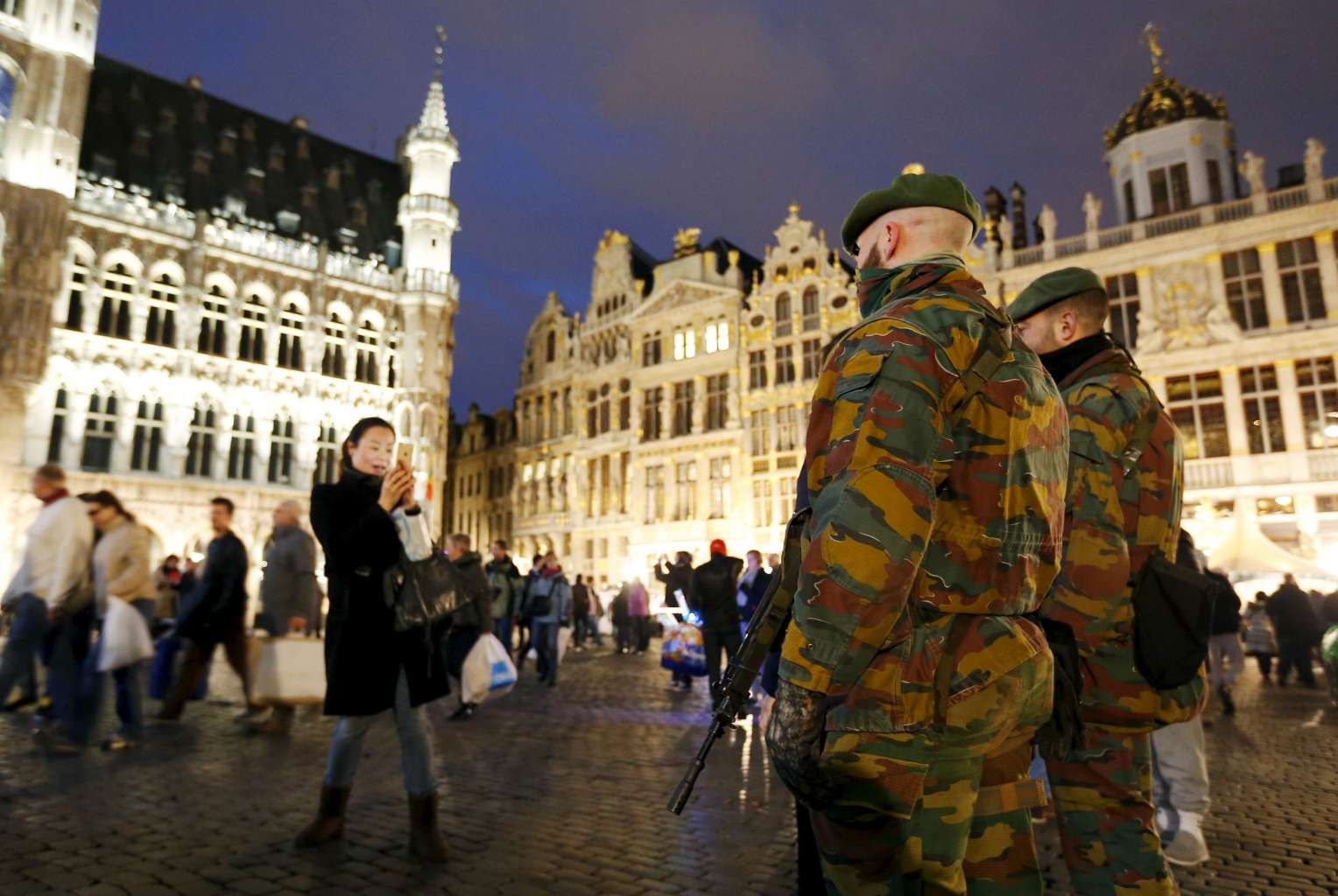 Belgian soldiers patrol a Christmas market in Brussels, Belgium.