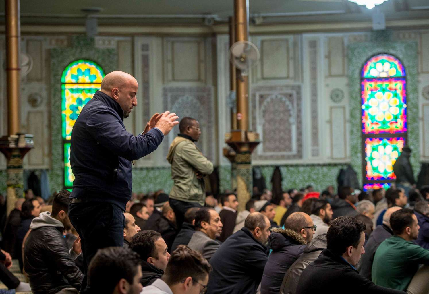 Muslims offer prayers at the Grand Mosque in Brussels on Match 25, 2016, as Muslims gathered for the first Friday prayers in the wake of the suicide attacks at Brussels airport and a metro station.