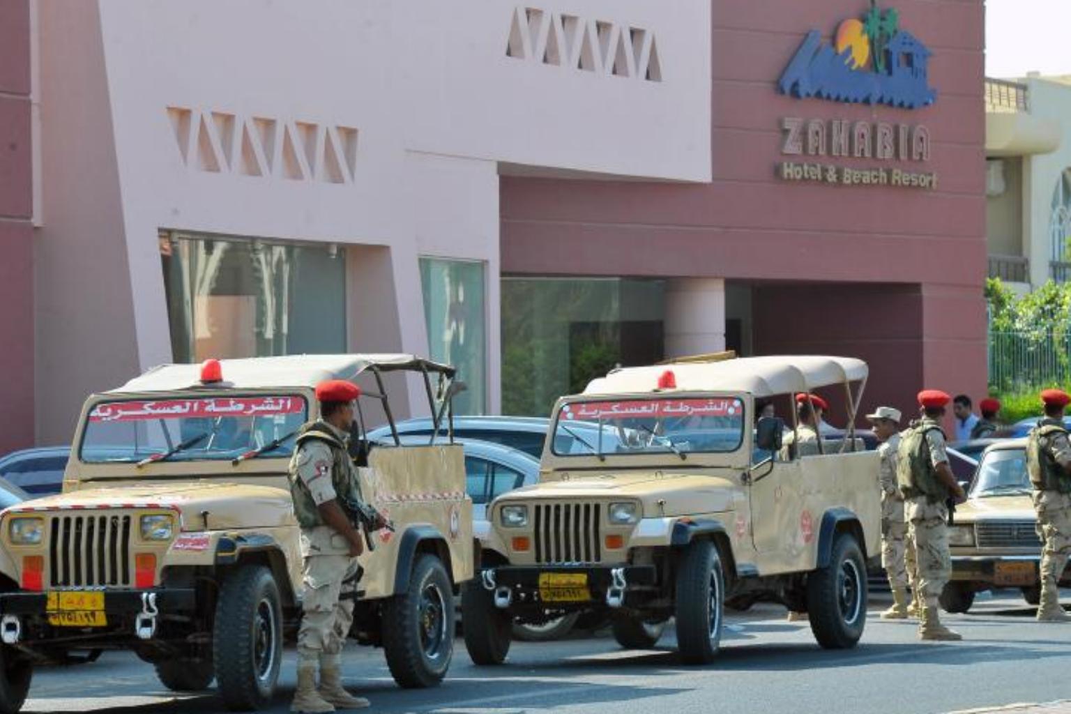 Egyptian military personnel infont of one of two beach resorts where the stabbing attack occured in Hurghada, Egypt, on July 14, 2017.