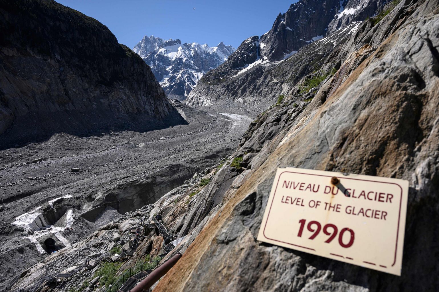 A sign indicating the level of the Mer de Glace glacier in 1990 is pictured in Chamonix, France, on June 17, 2019.