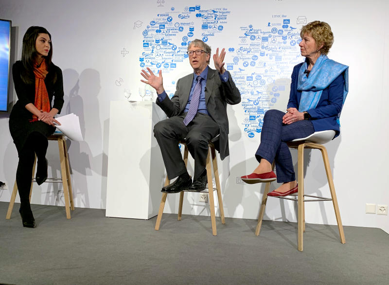 Billionaire philanthropist Bill Gates at an informal discussion in Davos on Jan 23, with Dr Sue Desmond-Hellmann, CEO of the Bill & Melinda Gates Foundation. The session was moderated by TV anchor Shereen Bhan (left).
