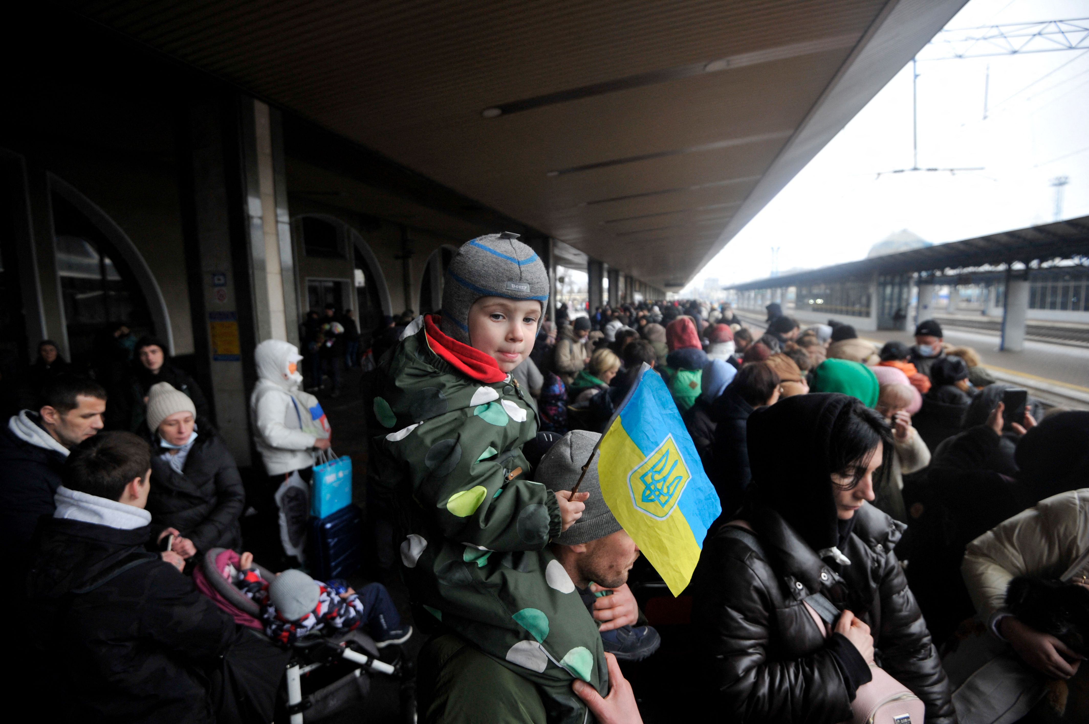 A man holds a boy with a Ukrainian flag, as they wait for an evacuation train at Kyiv's railway station, on March 2, 2022.