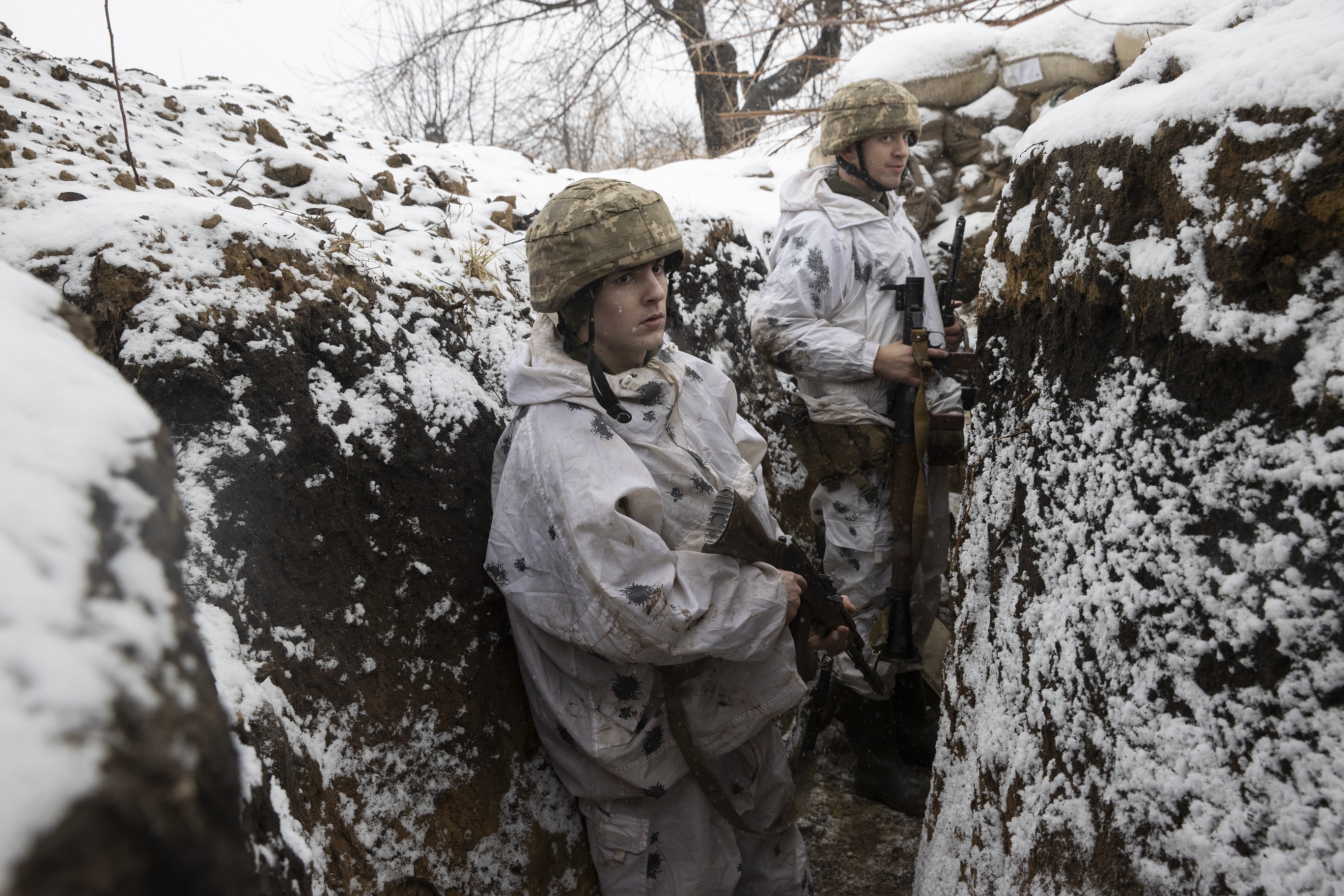 Members of the Ukrainian military are pictured in a front-line trench in Katerynivka, in eastern Ukraine, on Jan 18, 2022.