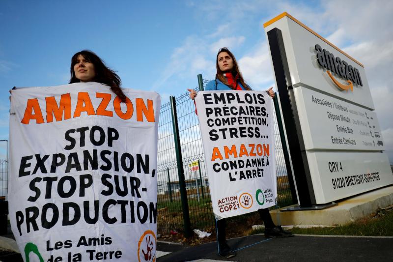 Environmental activists block an Amazon centre in Bretigny-sur-Orge, France on Nov 28, 2019, to protest against the company's labour policies and impact on climate change.