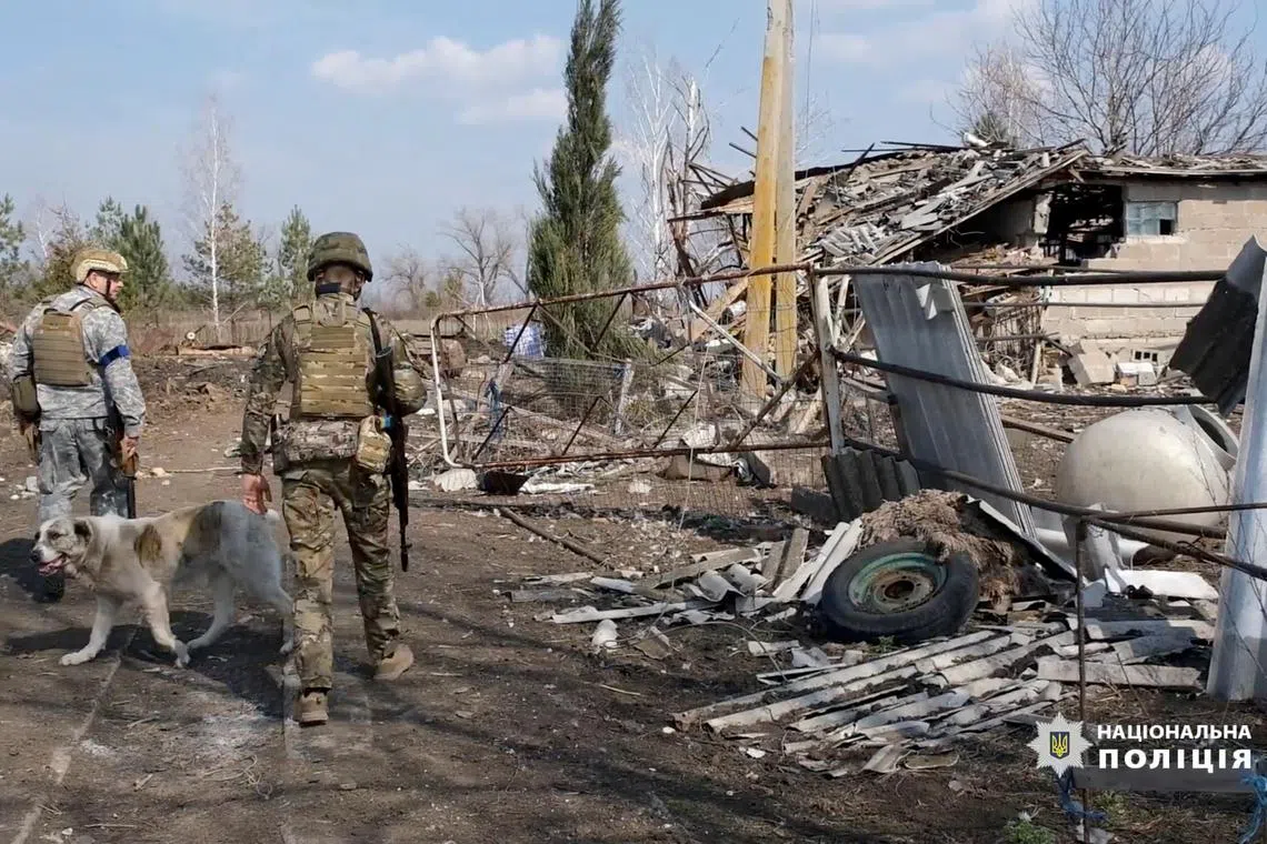 Police officers walk near damaged buildings, amid Russia’s attack on Ukraine, in Avdiivka, Donetsk region, on March 28.