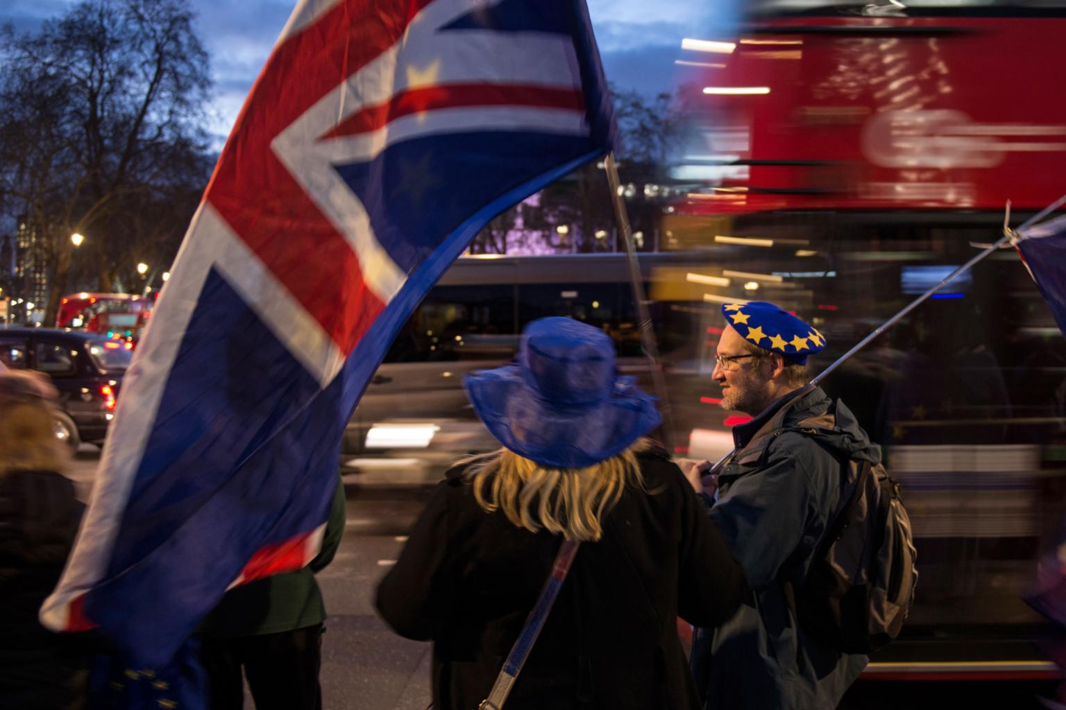 Anti-Brexit supporters hold flags as they demonstrate outside the Houses of Parliament on Jan 14, 2019.