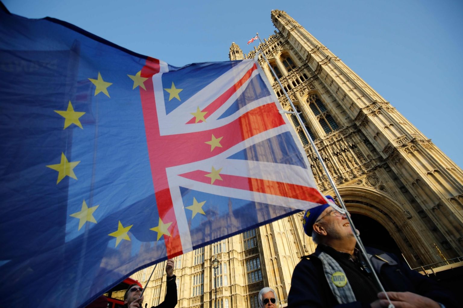 An anti-Brexit activist flies a flag showing the colours of the UK and the EU outside the Houses of Parliament in London, on Dec 11, 2018.