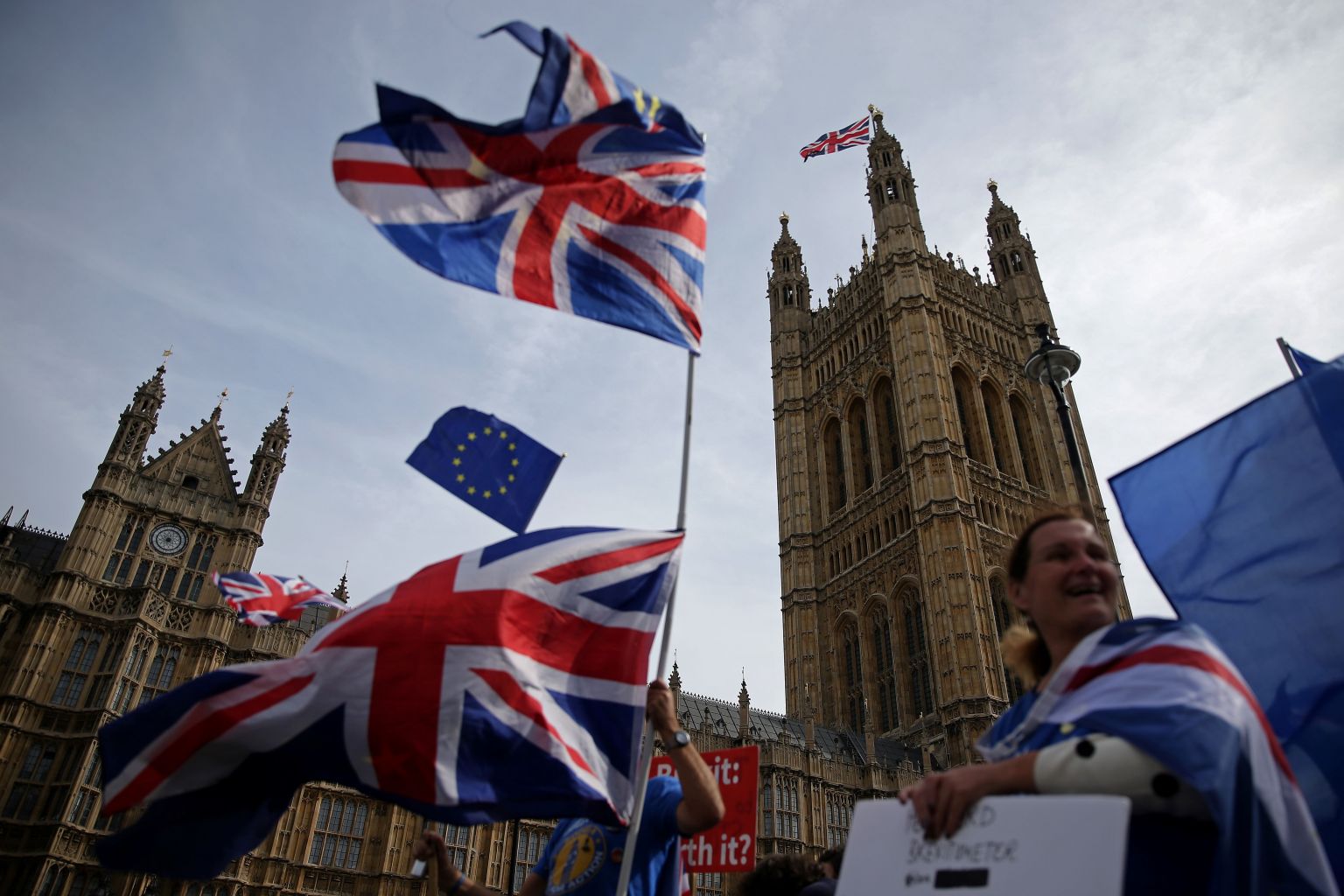 People wave British and EU flags as they protests outside the Houses of Parliament in London on Sept 10, 2018.