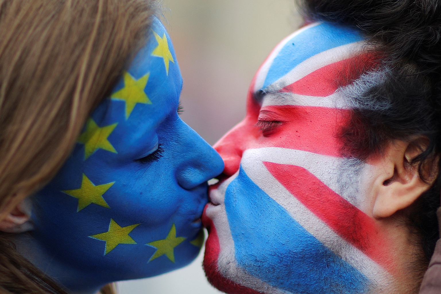 Two activists with the European Union flag and Union Jack painted on their faces kissing in front of Brandenburg Gate in Berlin to protest against the British exit from the EU, on June 19.