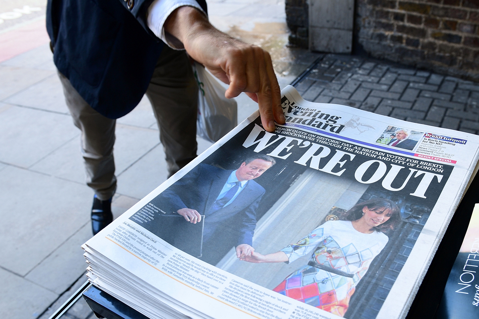 A man takes a copy of the London Evening Standard with the front page reporting the resignation of British Prime Minister David Cameron and the vote to leave the EU in a referendum, on June 24.