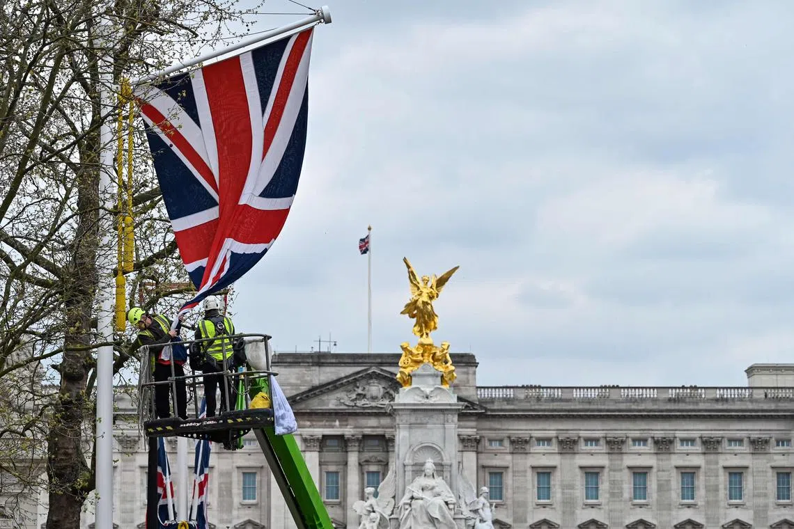 Workers hanging a Union Jack flag along The Mall, leading to Buckingham Palace, in London on April 18, 2023.