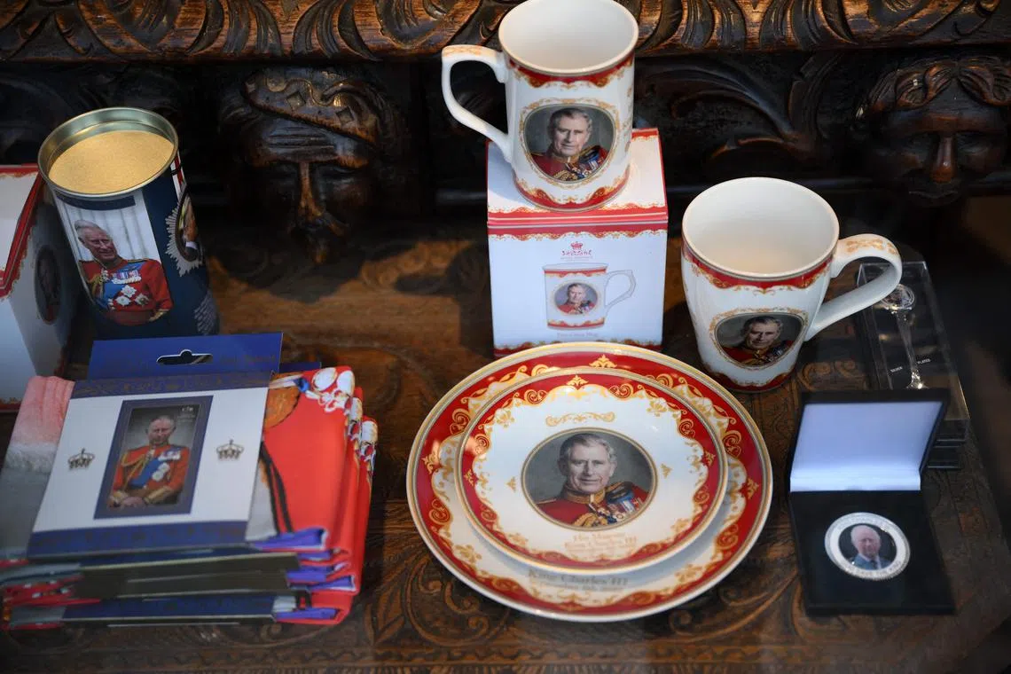 Official souvenirs on display at Lambeth Palace celebrating King Charles III and Camilla ahead of their coronation.