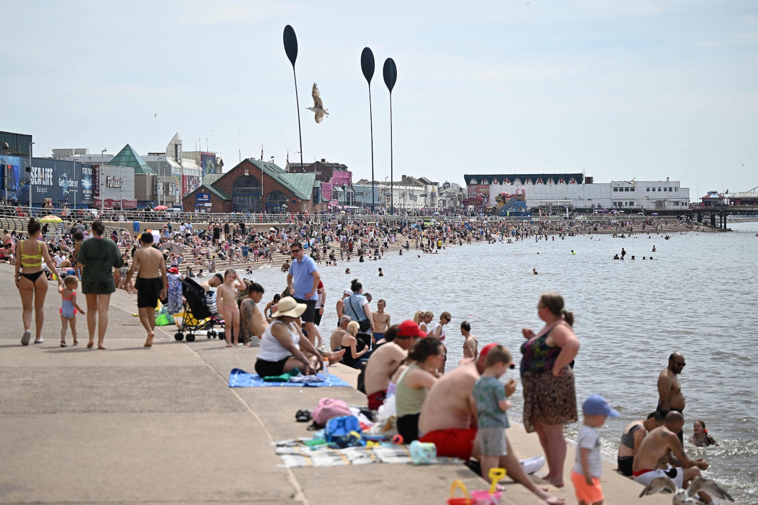 Beachgoers enjoying the sun and the sea in Blackpool, north-west England, on July 17, 2022.