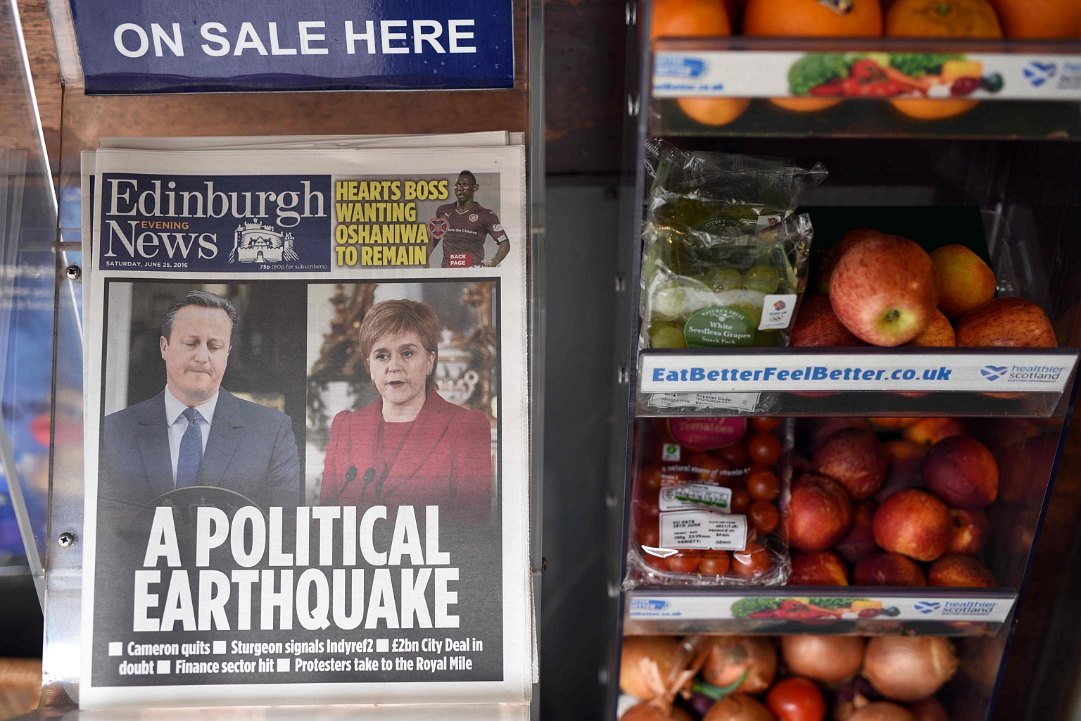 Newspaper front pages showing photos of British Prime Minister David Cameron and Scotland's First Minister and Scottish National Party leader Nicola Sturgeon on June 25.