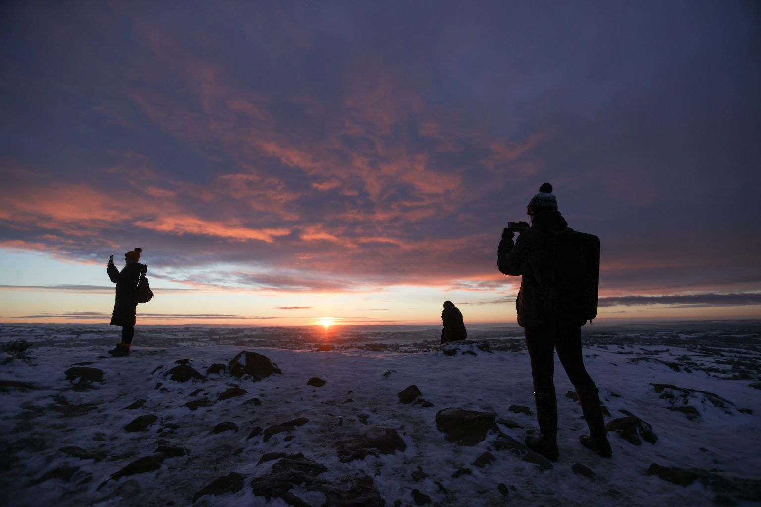 People watch the sunrise from Mow Cop Castle in Mow Cop, Britain, Jan 2, 2021.