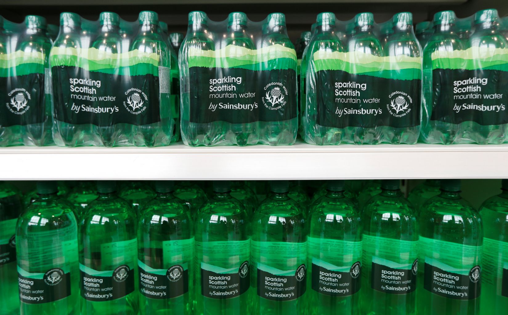 Bottles of Sainsbury's sparkling water are displayed in a store in Redhill, Britain, on March 27, 2018.