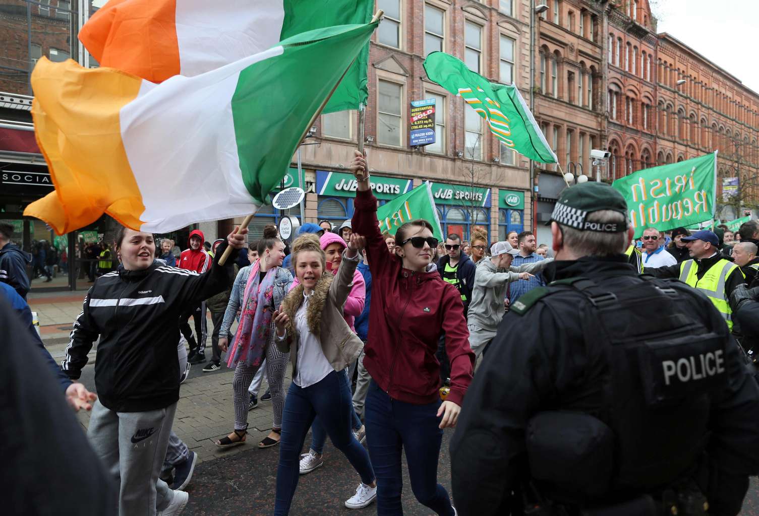 Republicans march through Belfast city centre in Northern Ireland on April 24, 2016, in commemoration of the 1916 Easter Rising.