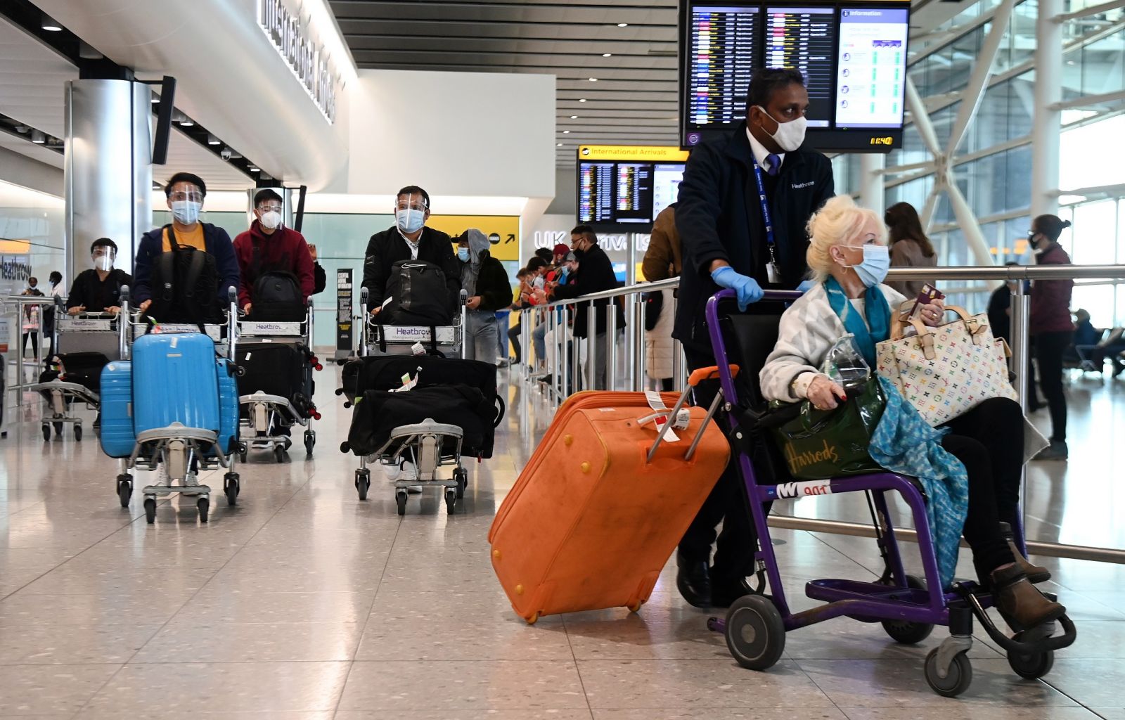 Travellers arrive at Heathrow Airport in London, on May 3, 2021.